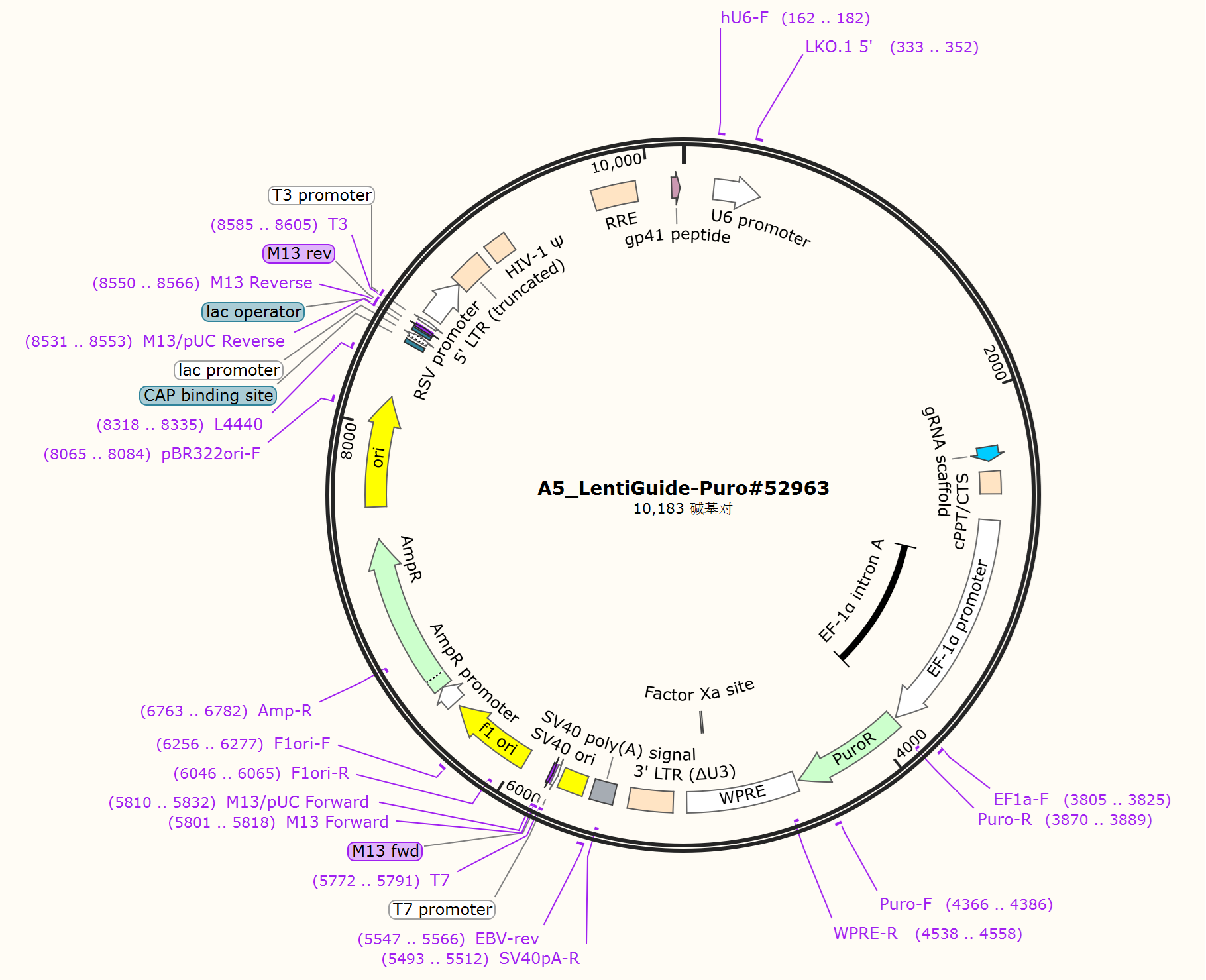 LentiGuide-Puro,EF1α启动子驱动Puro表达,human U6驱动sgRNA表达,Puro抗性。需搭配表达Cas9的细胞使用。