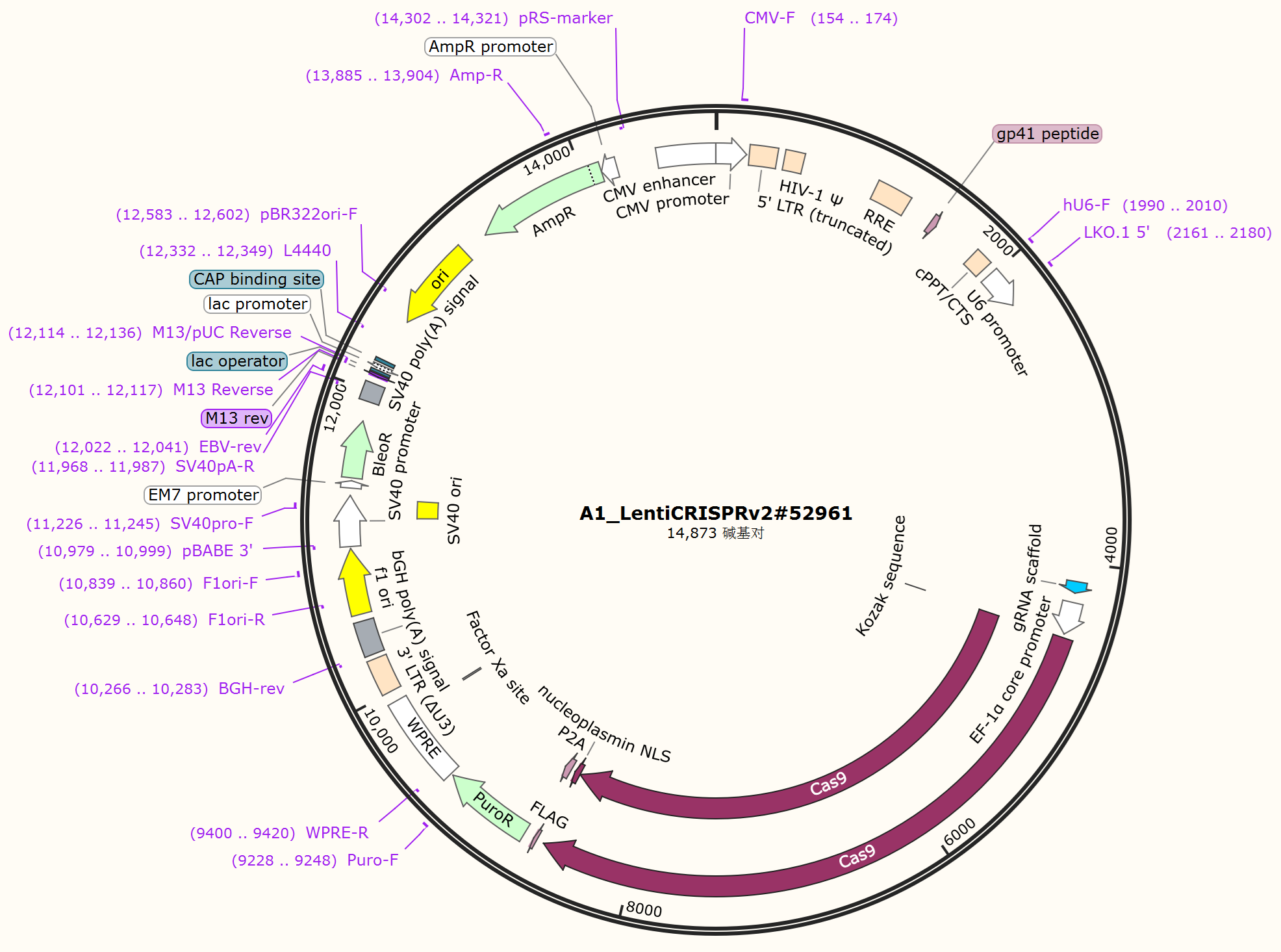 LentiCRISPRv2-Puro,EF1α启动子驱动Cas9和Puro表达,human U6驱动sgRNA表达,Puro抗性。